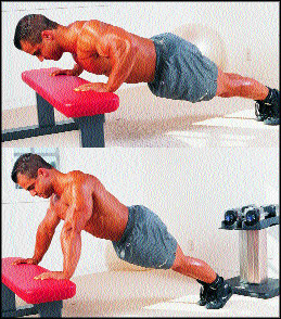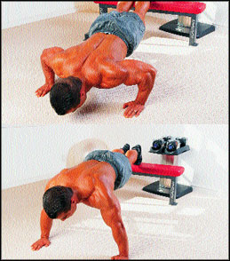 Выполнение: Это абсолютно то же движение, что и обычные отжимания с той разницей, что ваши носки упираются не в пол, а на поверхность скамьи. Кисти рук надо поставить чуть впереди линии плеч. Это никак не скажется на эффективности, зато поможет равновесию в исходном положении.