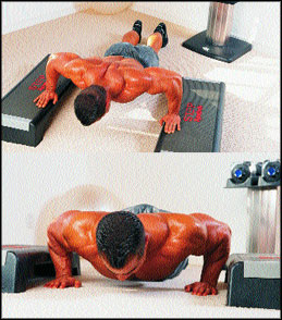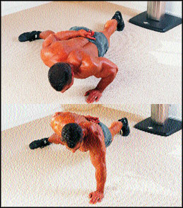 Выполнение: Чтобы не повредить кисти или запястья, выполняйте это движение на какой-нибудь мягкой пружинящей поверхности. В исходном положении обопритесь ладонями на две опоры высотой 15-20 см. Отжавшись кверху, оттолкнитесь от опор и “приземлитесь” на пол между ними. Кисти должны оказаться на ширине, характерной для обычных отжиманий. Тут же согните локти и мягко опустите грудь к полу. Из нижней позиции взрывным усилием вытолкните себя кверху и снова “запрыгните” на опоры. Секрет в том, чтобы не делить движение на фазы и выполнять на одном дыхании.