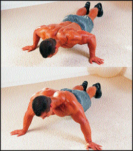 Выполнение: Примите положение упора на прямых руках. Голову не задирайте и не опускайте вниз. Удерживайте ее строго на линии позвоночника. Кисти рук расставьте чуть шире плеч. Сначала опуститесь в нижнюю позицию, а потом мощным усилием выжмите себя на прямые руки. В верхнем положении статически посильнее напрягите грудные на счет “раз-два”. Только потом опускайтесь к полу. Не распрямляйте локти до упора! Оставляйте их чуть согнутыми. Держите пресс напряженным. Не допускайте “провисания” живота!