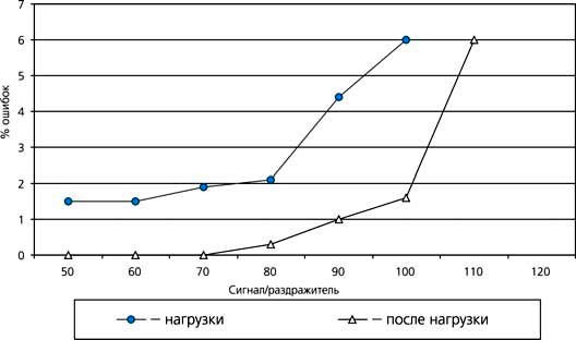 Рис. 1. Средние значения количества ошибок (в %), допущенных спортсменами-легкоатлетами до и после соревновательной деятельности по методике моделирования ступенчато повышающейся психической нагрузки