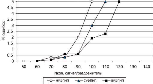 Количественным выражением функциональной подвижности нервных процессов служит предельная частота предъявления раздражителей на самой максимальной скорости, при которой испытуемый допускал не более 5, 0-5, 5 % ошибок. Отметим, что в разработанной методике оценки УФПНП (Н. В. Макаренко, 1991) выбор сигнальных стимулов сводится к оценке реакции на вербальные раздражители (слова, обозначающие животных, растения, неодушевленные предметы). В наших исследованиях для выявления индивидуальных особенностей УФПНП спортсменов применялись сигнальные значения на невербальные раздражители (фигуры: квадрат, круг, треугольник). Реакция же на вербальние раздражители сводилась к общему порогу предельной частоты предъявления до уровня 60 - 70 сигналов в минуту. Такой уровень зарегистрирован в наших научно-экспериментальных исследованиях на вербально-двигательную реакцию и у квалифицированных спортсменов-пловцов (30 человек), гребцов (23), велосипедистов-шоссейников (43), лыжников (39), дзюдоистов (12), фехтовальщиков (10). Данную особенность можно объяснить высокой реактивностью в спорте высших достижений на раздражители, более адресованные первой сигнальной системе, чем второй.