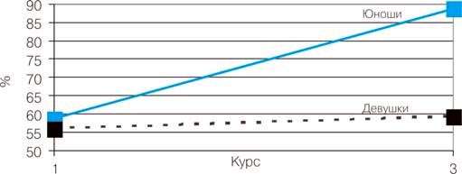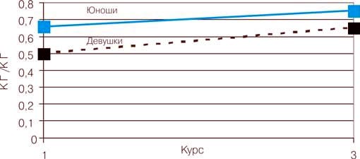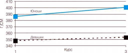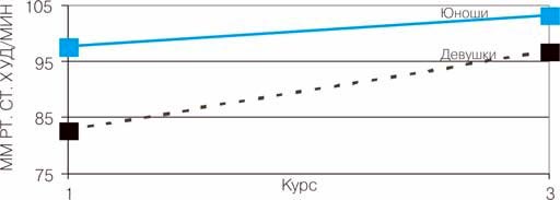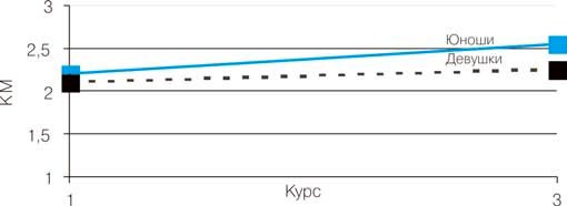 На рис. 1-6 показана динамика средних показателей по основным тестам на протяжении срока обучения на 1-3-м курсах. Анализ показателей тестирования и результатов статистической обработки данных ставил задачу получения ответов на следующие вопросы:
