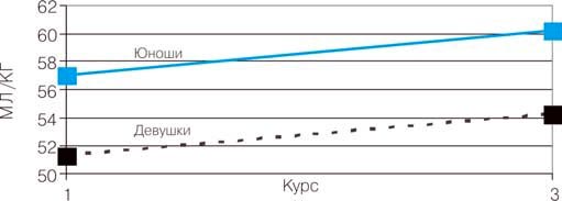 1. Приведенная на рис. 1-6 динамика физического развития и состояния здоровья студентов 1-3-го курсов свидетельствует о целенаправленном профессионально-прикладном процессе физического совершенствования студентов обоего пола по всем без исключения тестам "Паспорта". Статистический анализ достоверности различий выборок по t-критерию Стьюдента, так же как и в предыдущем случае, подтверждает недостоверность их различий и носит случайный характер, не имеющий закономерного, позитивного тренда в течение длительного срока обучения.