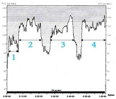Показатели ЧСС за время одного занятия в уличный баскетбол: 1 - разминка, 2, 3, 4 - игра в стритбол
