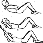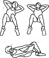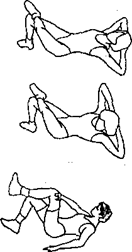 Лежа на спине, ноги согнуты. Согнутую правую ногу положите на колено левой ноги, руки за голову, локти разведены в стороны. Приподняться и наклониться правым локтем к левому колену. Лежа на спине, левую ногу перекинуть через правую, левую руку в сторону, правой рукой сильно нажать на левое бедро и держать несколько секунд. |