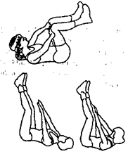 Лежа на спине приподнять согнутые в коленях ноги и голову. Ладони на коленях с усилием давят на них, так чтобы ногам приходилось преодолевать сопротивление. Лежа на спине, ноги вверх слегка согнуты в коленях. Вытянуть руки вперед по направлению к носкам. Поясницу прижмите к полу. |