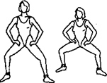 Разработка ягодичных мышц, задних мышц бедра Стоя, ноги врозь, руки на бедрах, живот втянут. Сгибая колени, движение выполнять вниз - назад до тех пор, пока бедра не встанут параллельно полу. Зафиксируйте положение, вернитесь в исходное положение. |