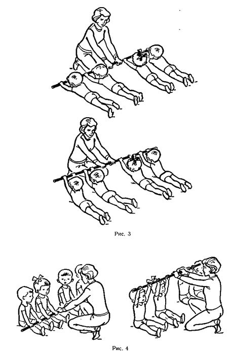3. И. п.: лежа на животе, держаться за палку обеими руками хватом сверху. Воспитатель немного приподнимает палку, и вместе с нею дети приподнимают корпус; палку медленно опускает, и (дети возвращаются в исходное положение (рис. 3).