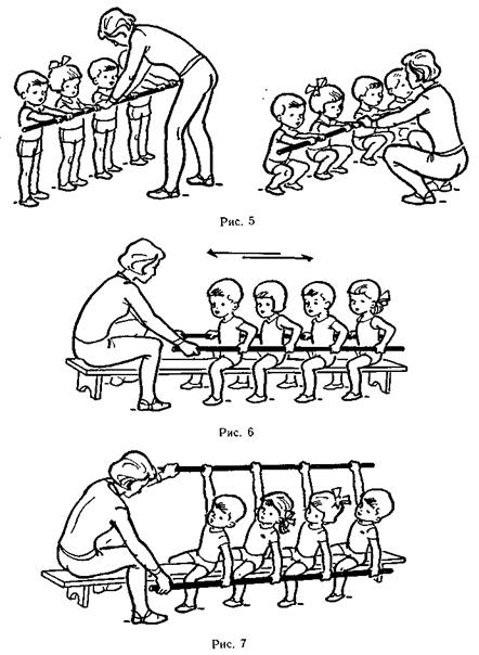 поднимает палку, дети подтягиваются к ней и садятся; по сигналу «ляжем» палку медленно опускает, дети возвращаются в исходное положение (рис. 1).