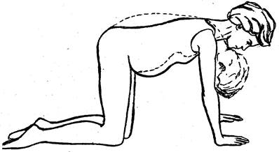 Это упражнение рекомендуется в течение всего периода беременности, вплоть до родов, так как оно уменьшает нагрузку позвоночника беременной маткой. Стать на колени и опереться на руки, расслабить мышцы спины (без чрезмерного изгиба позвоночника). Голова, шея и позвоночник находятся на прямой линии. Изгиб позвоночника вверх с опусканием головы и сильным напряжением мышц живота и ягодиц. Постепенное расслабление и возврат к исходной позиции. Повторяем пару раз.