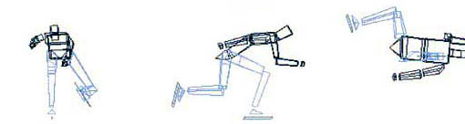 При построении имитационных антропоморфных компьютерных моделей исходили из того, что движение человека можно представить в виде определенной последовательности фаз, повторяющихся двигательных циклов. В большинстве локомоций человека кинематические параметры движения достаточно хорошо изучены. Известны временная длительность фаз, средняя скорость звеньев в фазах, углы и угловая скорость в суставах в начале и конце каждой фазы. Так, нормальная ходьба состоит из следующих фаз: переднего толчка, заднего толчка и маха. В беге на коньках фазовый состав движения следующий: фазы свободного проката (I фаза), одноопорного отталкивания (II фаза) и двухопорного отталкивания (III фаза) [18]. Рассмотрим задачу имитационного моделирования локомоций человека на примере бега на коньках.