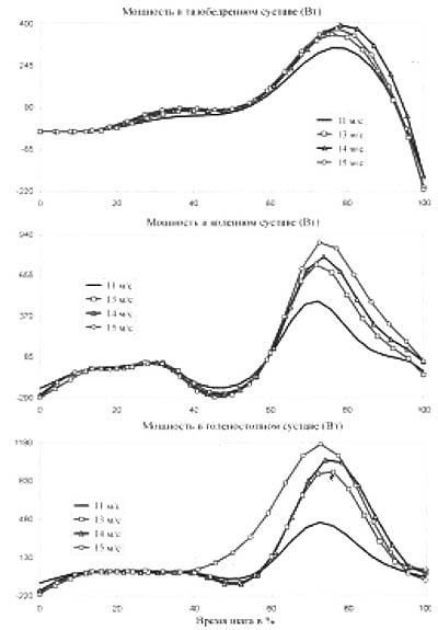 Механическая мощность в суставах толчковой ноги. Помимо механической работы рассмотрим еще один показатель силовой активности мышц - мощность (также в проекции на ось X инерциального базиса). Мощность по своим составляющим: угловой скорости и моменту - в большей степени соответствует физиологическим особенностям функционирования мышцы, а именно зависимости "сила-скорость" . Увеличение скорости бега с 11 до 15 м/с меняет экстремум мощности в тазобедренном суставе на 24%. В коленном и голеностопном суставах с увеличением скорости бега максимальная мощность возрастет в два раза (рис. 4).