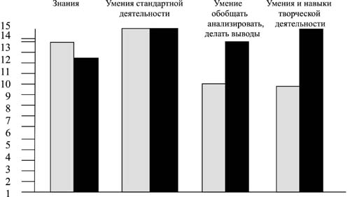 Дальнейший анализ данных, отраженных на диаграмме (см. рисунок), позволяет говорить об эффективности технологии проектов, которая позволила на четвертом уровне вывести студентов на достаточно высокие показатели.