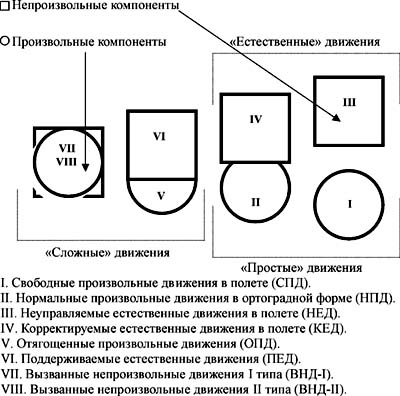 Понятие произвольности связано в данном случае с двигательным действием, подчиняющимся воле исполнителя (см. каузально "простые" движения, рис.1, б). Это понятие не предполагает квалификации качества полученного движения, поскольку произвольное движение не всегда соответствует намерениям исполнителя и может быть ошибочным. Соответственно непроизвольное движение, как было отмечено, обусловливается его физической, биомеханической природой и в определенных условиях возникает помимо воли исполнителя, желает он того или нет (см. рис.1, фиг.