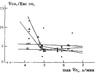 Реакция организма на тренировочную нагрузку в плавании во многом определяется индивидуальным уровнем развития аэробных и анаэробных возможностей спортсменов. Интегральным показателем, характеризующим степень участия аэробного и анаэробного метаболизма в общей энергетике работы, является отношение общего уровня выделения углекислого газа к уровню выделения неметаболического "излишка" CO2 (VCO2/ExcCO2) [9]. Это отношение показывает, во сколько раз уровень окислительных процессов в тканях превышает скорость гликолиза. Чем больше значение этого показателя, тем выше доля аэробного метаболизма, и, наоборот, чем меньше значение этого показателя, тем выше доля анаэробного метаболизма в энергетическом обеспечении данного вида нагрузки.