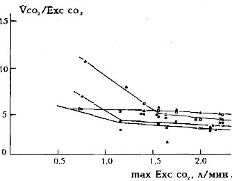Для выявления индивидуальных особенностей в ответ на тренировочную нагрузку нами были проанализированы зависимости изменения показателя VCO2/ExcCO2 от индивидуального максимума потребления O2 (МПК) и индивидуального максимума выделения неметаболического "излишка" CO2 (ЕхсCO2) при проплывании дистанций 50, 100, 200 и 400 м с помощью движений рук, ног и в полной координации способами кроль на груди и на спине, дельфин, брасс.