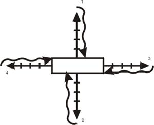 Рис. 1. Схема организации теста: 1 - прыжок в длину с места вперед; 2 - прыжок в длину с места спиной вперед; 3 - прыжок в длину с места боком вправо; 4 - прыжок в длину с места боком влево; прямая стрелка - прыжок; волнистая стрелка - произвольное вращение в центр