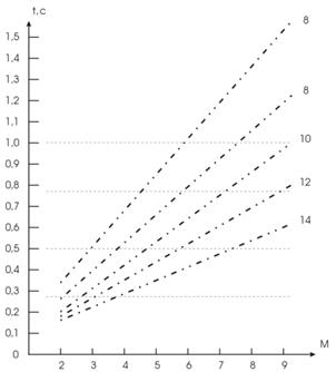Сравнительные оценки результатов тестирования двигательной баллистической координации. Анализ использования варианта 3 в практической деятельности показал, что временной интервал теста находится в пределах от 6 до 18 с, а суммарная величина дальности четырех прыжков варьирует от 2 до 8 м. При этом наблюдается достаточно высокая корреляция (r=0,82) между дальностью прыжков и временем их выполнения. Это позволило рассчитать номограмму оценочных значений показателей с диапазоном варьирования дальности прыжков от 2 до 8 м и временного интервала - от 6 до 14 с (рис. 2).
