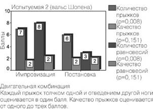 Результаты исследования. Существенным фактом успешного исполнения двигательной композиции является хороший настрой на музыку. В анкете испытуемые утверждали, что им нравится музыка и она побуждает их к движению. Все испытуемые выполняли движения под вальс Шопена на достаточно высоком уровне как при импровизации, так и при режиссерской постановке. Движения характеризовались четкостью, были свободны и разнообразны. Оценка двигательных комбинаций от импровизации к постановке повысилась на 0,5 балла, однако улучшение результатов было статистически недостоверным. При сравнении четырех испытуемых из 1-й и 2-й групп стали очевидными следующие детали. Темп движения у всех испытуемых был существенно лучше благодаря предварительному музыкальному прослушиванию и неплохо совпадал как при импровизации, так и при режиссерской постановке. Это было подтверждено главным образом в ходе анализа множества движений. Количество движений при постановке слегка увеличивалось, было заметным также небольшое увеличение их темпа. Однако достоверных статистических различий обнаружено не было (рис. 2).