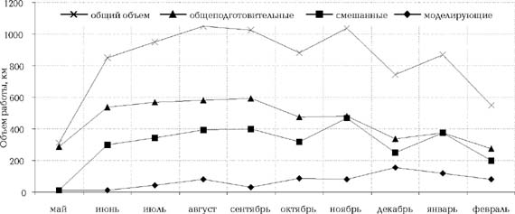 Рис. 8. Динамика параметров объема работы (км) за месяц, выполненных с использованием моделирующих, смешанных и общеподготовительных упражнений в предолимпийском цикле тренировки Ю. Чепаловой