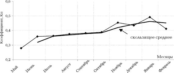 Оценка всех упражнений, примененных в предолимпийской подготовке Ю. Чепаловой, относительно ее целевой соревновательной деятельности (30 км, F: 20.02.1998 г.) свидетельствует о цикличности воспроизведения спортивных нагрузок и чередовании "острых" модельно-целевого типа нагрузок (Кп>0,5) и нагрузок подготовительного характера. В динамике нагрузок модельно-целевого характера на всем протяжении подготовки, от начала до кануна главных соревнований, присутствуют два этапа. Этап с умеренной тенденцией увеличения концентрации целевой деятельности (июнь - октябрь) и этап с динамичным ростом доли спортивных нагрузок с высокой концентра цией целевой деятельности - с ноября до кануна главных соревнований (рис. 10, 11).