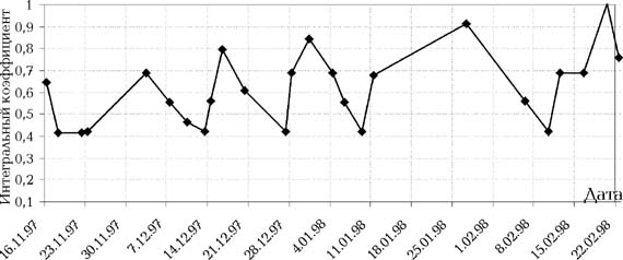 Рис. 10. Оценка динамики параметра интегрального коэффициента в предолимпийском цикле подготовки Ю. Чепаловой