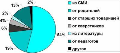 Итоги мониторинга оценки здоровьесбережения и наркоситуации в ЮФО свидетельствуют о том, что проблема распространения и употребления наркотических средств, психотропных и иных одурманивающих веществ по-прежнему чрезвычайно актуальна. В 11 лет каждый второй знает о наркотических свойствах конопли или препаратов опийной группы, в 13 лет - уже две трети, а к 16 годам доля детей, осведомленных о наркотических веществах, приближается к 80%. Возникает вопрос: из каких источников подростки и молодежь пополняют знания о психоактивных веществах? Это достоверно и убедительно отражено на рис. 1. Так, 54% сведений получено из средств массовой информации. К сожалению, редко эта информация дает правдивое представление о страшной опасности первых шагов практического знакомства с этим пороком. Однако есть громадный резерв различных источников (родители, педагоги, друзья и т.д.), которые могут вовремя проинформировать и уберечь молодое поколение от этой беды.