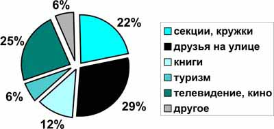 Данные диаграммы убедительно свидетельствуют о наличии большого резерва свободного времени (более 50% - общение на улице, просмотр телепередач и др.), которое можно перераспределить на более рациональную и активную досуговую деятельность: клубы по интересам, художественную самодеятельность, физическую культуру, спорт, туризм, технические кружки и т.д.