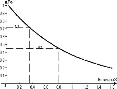 3. Расчет функциональной надежности (Рф). Данный критерий спортивной деятельности учитывает морфофункциональную особенность организма спортсмена (Рфо) и уровень профессионально-прикладной спортивно-технической подготовленности (Рфп). Величина функциональной надежности Рф находится по номограмме 1 с помощью величины Х, которая определяется по формуле: Х=Кп - 1 (4). Выражение (Кп - 1) может быть больше 0,5, и тогда в формулу (4) вводится коэффициент 0,2125, и она приобретает следующий вид: Х=0,2125(Кп - 1) (5). Найденные таким образом величины (с помощью формул 4 или 5) характеризуют уровень надежности функциональных систем организма (табл.1).
