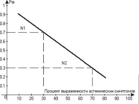 Пример 3. Оценка функциональной надежности на индивидуальном уровне. Выраженность симптомов астенизации данного спортсмена (см. пример 1) составляет 70%. По номограмме на рис. 4 находим (пунктирная линия N2), что функциональная надежность спортсмена Рф=0,3, т.е. уровень надежности физиологической системы указывает на "опасность срыва функций организма" (см. табл. 1).