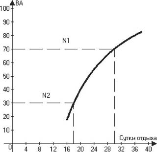 В зависимости от выраженности симптомов астенического состояния по номограмме рис. 5 определяется продолжительность отдыха на социальном и индивидуальном уровнях в сутках. Отдых необходим для восстановления функционального состояния физиологических систем до исходного уровня. В приведенном выше примере 1 30% спортивной команды имеют астенический синдром. Для такой команды отдых должен составлять 18 суток (пунктирная линия N2 на номограмме рис. 5). В этом же примере для отдельного спортсмена-единоборца, у которого выраженность астенического синдрома равна 70%, такой отдых необходим в течение 30 суток (пунктирная линия N1 на номограмме рис. 5).
