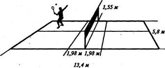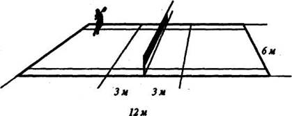 Размеры площадки такие же, как и для бадминтона (см. рисунок). Можно играть и на волейбольной площадке.