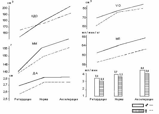 Возрастно-половые особенности адаптации юных спортсменов связаны с темпами ростового и биологического развития. Юные спортсмены одной возрастной группы (15 лет), но с разными темпами биологического созревания (ретарданты, нормальное развитие, акселераты) характеризуются различными морфофункциональными возможностями сердца и аэробными показателями (рис. 4). Отчетливо прослежены возрастно-половые особенности повышения с возрастом работоспособности . Выявлены большие метаболические сдвиги и более напряженная адаптация у 14-летних мальчиков и девочек - баскетболистов. Обнаружена тенденция к снижению функционального состояния сердца с высоким напряжением регуляторных систем у девочек 13 лет и мальчиков 16 лет. Период повышенной парасимпатической активности отмечен у девочек в 15 лет, у мальчиков - в 17 лет.