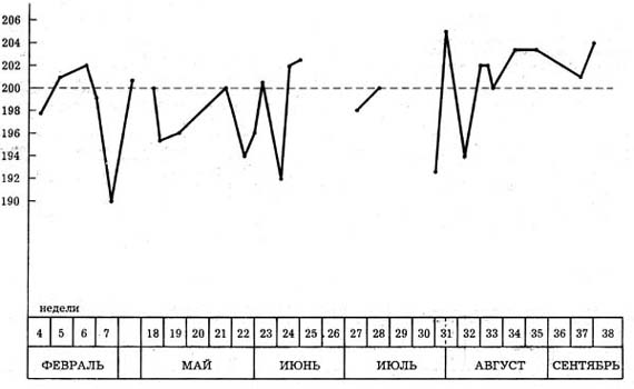 Убедительной иллюстрацией 'изложенных выше взглядов может послужить динамика спортивных результатов рекордсменки мира и олимпийской чемпионки Атланты-96 в прыжках в высоту С. Костадиновой (Болгария) в 1996 г. Из таблицы видно, что за период с 27.01 по 16.09 1996 г., который охватывает 34 недели, она участвовала в 29 официальных. соревнованиях (происходящих в различных климатических поясах), из которых она выиграла 20 (не берется в расчет олимпийское отборочное соревнование в Атланте). Из приложенного к рис. 1 графика очевидно, что расположение недель соревнований (всего 18) обрисовывает динамику трехциклической периодизации тренировочного и соревновательного процессов (с одним промежуточным соревновательным микроциклом между вторым и третьим макроциклами - неделя № 27). Эта уникальная соревновательная программа - бесспорное доказательство исключительно высокой степени тренированности.