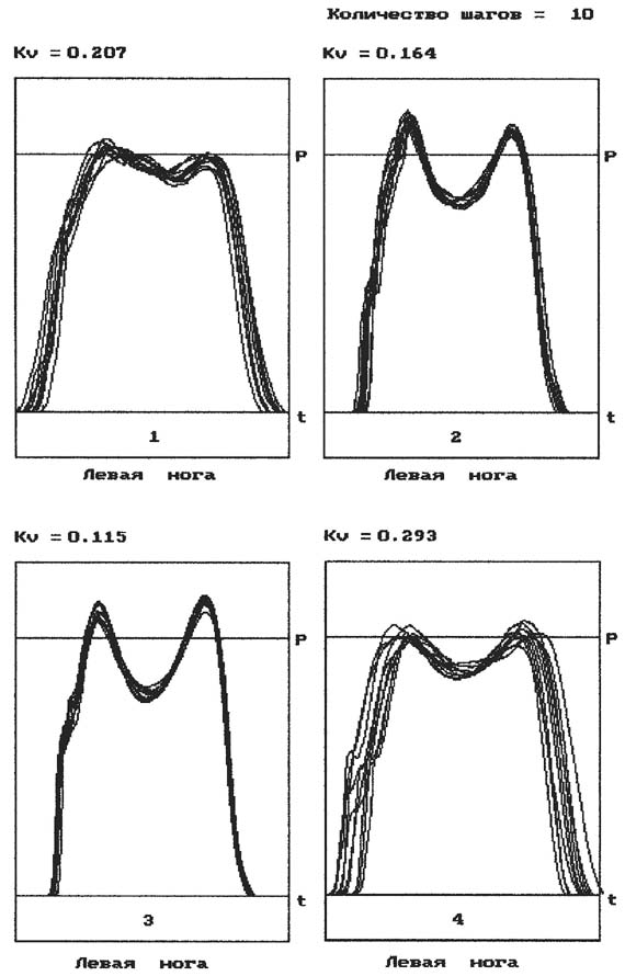 Для количественной характеристики различия формы вертикальной составляющей реакции опоры от шага к шагу при ходьбе нами предложен коэффициент вариабельности реакции опоры Kv, пропорцио нальный площади зоны, в которой расположены все динамограммы вертикальной составляющей реакции опоры. Этот коэффициент при нормальной ходьбе составляет для левой ноги 0,16 ± 0,03 и для правой - 0,17 ± 0,04 (указанные значения получены на основе обследования акта ходьбы 69 здоровых испытуемых). Данный коэффициент отражает вариабельность процесса нагружения каждой из конечностей при ходьбе, поэтому он имеет свое значение для каждой из них.