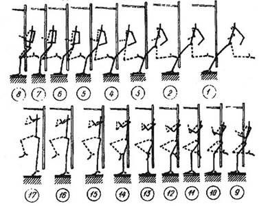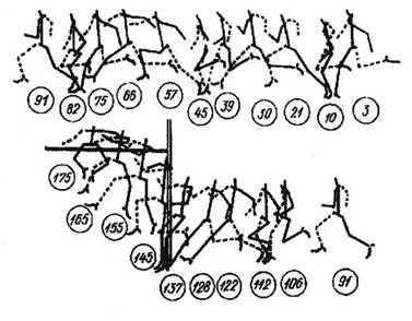 Важный механизм разбега - продвижение спортсмена без значительных вертикальных колебаний (см. рис. 2, кадры 106 -137). Действие этого механизма наблюдается во всех взаимодействиях с опорой, когда подъем ОЦМ тела вверх нежелателен или невозможен. Основные управляющие движения - различные сочетания действий в голеностопном, коленном и тазобедренном суставах. Причем если одни суставы обеспечивают продвижение вперед, то другие нейтрализуют возникающее при этом движение вверх. Характер сочетания суставных движений зависит от исходного положения звеньев по отношению друг к другу и от того, в какой фазе (переднего шага, близко к вертикали, заднего шага) осуществляется действие.