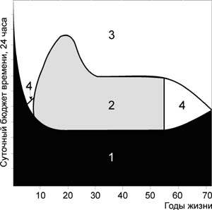 1 - сон; 2 - учеба (работа); 3 - свободное время; 4 - "втягивающие" периоды жизни