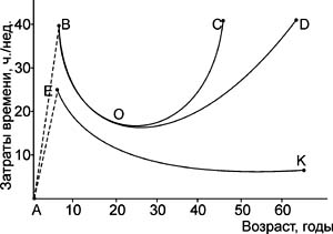 Наибольшую информационную нагрузку на представленном рисунке несет его срединная часть, отражающая временную взаимосвязь учебно-трудовой деятельности человека с его свободным временем. Рисунок дает возможность увидеть, насколько велика и несопоставима с другими периодами жизни нагрузка в студенческие годы. Сравнение представленного на рисунке построения с имеющимися в литературе по возрастной физиологии графическими изображениями физиологических функций организма показывает, что контуры ни одной из них в завершающей стадии своего развития не имеют такого алогичного очертания. Отсюда следует вывод о том, что переход от трудовой деятельности к заслуженному отдыху должен иметь постепенный, поэтапный характер с последовательным уменьшением доли труда, напоминая собой "втягивающий" режим подготовки детей к школе в старших группах детского сада (на рисунке эти периоды жизни обозначены цифрой 4).