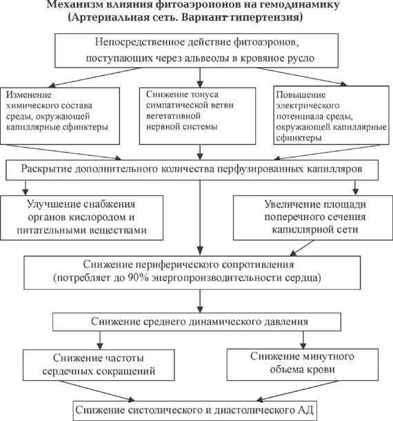 Изменения в гемодинамике происходили в такой последовательности. В результате поступления фитоаэроионов изменился химический состав в зонах прекапиллярных сфинктеров. Кроме того, увеличился электрический потенциал среды, окружающей сфинктер. Действие эфирного масла ведет к снижению напряженности симпатической ветви, а закрытие сфинктера происходит именно как результат повышения тонуса симпатикуса. Обратим внимание еще на одну деталь. В результате снижения напряженности симпатической ветви произошло раскрытие дополнительного качества прекапиллярных сфинктеров, до этого находившихся в "резерве". Раскрытие некоторой части сфинктеров ведет к улучшению микроциркуляции крови, а именно этой части кровообращения в настоящее время придают все больше значения, как фактору, обеспечивающему оптимальное функционирование органов и тканей целостного организма. Дополнительное раскрытие прекапиллярных сфинктеров увеличило суммарную площадь поперечного сечения капилляров. Обратим внимание на то, что суммарная площадь поперечного сечения капилляров возрастает пропорционально квадратам радиусов дополнительно раскрывшихся капилляров, поэтому увеличение количества перфузированных капилляров многократно увеличивает суммарную площадь поперечного сечения. Поскольку в регионе прекапилляр-вену ла движение крови идет уже не пульсирующим, а ламинарным потоком, то начали действовать иные, чем на дистанции, законы гидродинамики аорта-прекапил ляр. Поэтому сопротивление току жидкости в регионе прекапилляр-капилляр снижается пропорцио нально сумме квадратов радиусов раскрывшихся капилляров. В свою очередь, периферическое сопротивление - это сопротивление току крови на участке прекапилляр-капилляр, и на его преодоление затрачивается до 90% всей энергопроизводительности сердца, и это сопротивление резко снижается. Уменьшение периферического сопротивления, в свою очередь, ведет к снижению среднединамического давления, необходимого для проталкивания крови в этом районе. Но среднединамическое давление - это интегральная величина от частоты сердечных сокращений и объема систолического сердечного выброса, которые совокупно дают значение минутного объема крови. Круг изменений замыкается.