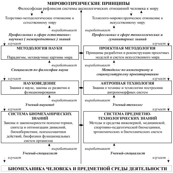 В системе научных знаний происходит переход от дисциплинарно ориентированной специализации исследований к системной интеграции общенаучного и философского порядка. В ходе развития биомеханики возникает необходимость выхода за пределы тех или иных "дисциплинарных матриц" (частнонаучных теоретических схем, моделей, законов и понятий) в сферу глобальных интертеоретических принципов познания и преобразования мира на основе концептуального, а также мировоззренческого единства (см. схему).