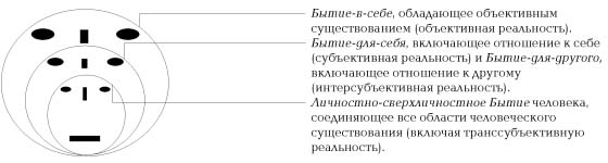 На схеме маленькая голова соответствует системе объективных знаний о человеке - каков он есть в действительности ("деперсонализированное Я"). Познание себя осуществляется здесь в форме обезличенных интеллектуальных процессов (характерных для бессубъектной гносеологии) на основе абстрагирования и дискурсивного мышления. Средняя голова соответствует интерпретационной модели, выражающей позиционное отношение к себе, к миру и другим людям. Это такая рефлексивно-семантическая модель-пред ставление, которая осознается человеком именно как репрезентация ("представляемое Я"). Здесь обязательно встраивается отношение к самому себе (в рамках системы "Я" и "Другой Я") и отношение к другим людям (в рамках системы "Я" и "Другой Человек"). И, наконец, большая голова соответствует порождающей , креасофической модели деятельностного сознания ("Я-конструкту"), которое совместно с продуктивным мышлением и духовно-практической деятельностью воспроизводит Бытие Человека, конструирует Личность во всей полноте и уникальности ее существования (экзистенции), в том числе на основе трансличностного неперсонализированного сознания (надличностные архетипы, по К. Юнгу). Данные механизмы позволяют осуществить высшее погружение в реальность (В. Франкл), выйти за пределы себя самого (Ортега-и-Гассет), взглянуть на себя извне, как на снятую маску.