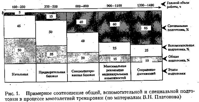 Из года в год увеличивается число тренировочных занятий и соревнований, растет общий объем нагрузки. От этапа к этапу многолетней подготовки изменяется соотношение различных средств, используемых в тренировочном процессе (рис 1).