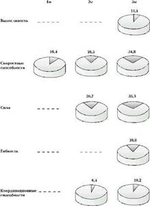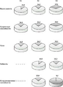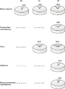 Рассмотрим количественные изменения степени влияния методики ППВ М2. В процессе воспитания выносливости выявлена следующая степень влияния: после первого месяца эксперимента - 12,6%; после второго - 17,8%; после третьего - 20,3%. Степень влияния методики в процессе воспитания скоростных способностей после третьего месяца тренировочных занятий составила 28%. При воспитании силы после второго месяца степень влияния была 27,9%, а после третьего - 35,9%. Степень влияния педагогического воздействия в процессе воспитания гибкости после третьего месяца тренировочных занятий выразилась в 14,9%, а координационных способностей - в 13,1% (рис. 2).