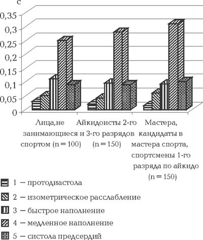 В группе мастеров спорта, кандидатов в мастера и перворазрядников установлена наибольшая продолжительность фазы медленного наполнения и систолы предсердий, чем у айкидоистов 2-го и 3-го разрядов, а также лиц, не занимающихся спортом.