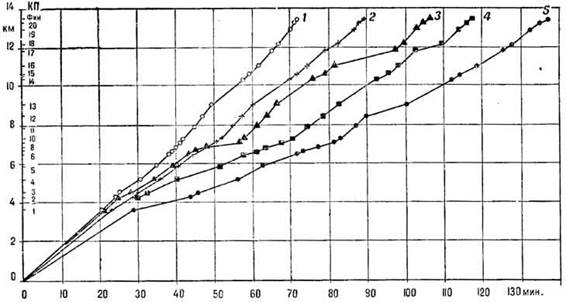 представлены результаты спортсменов, первыми отправившихся на трассу личного чемпионата страны 1975 г. Под № 1 стартовал Я. Мильян, под № 2 на 3-й мин. - А. Харин, еще через 3 мин. - А. Ширинян и затем - У. Жданове. Как и из графиков на предыдущем рисунке, здесь можно по наклону кривых судить о средней скорости на отдельных этапах. Появление пологих участков свидетельствует о потерях времени и ошибках. Некоторые участки идут абсолютно параллельно, следовательно, спортсмены бежали здесь с одинаковой скоростью.