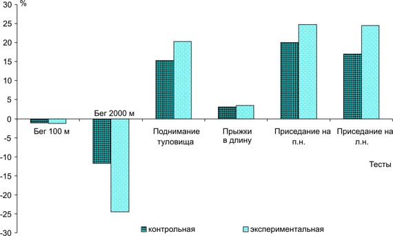 Статистически достоверно (р<0,05) улучшаются все изучаемые параметры физической подготовленности, однако наибольший прирост демонстрируют показатели силовой и базовой выносливости (р<0,01). По тесту "бег на 2000 м" в ЭГ прирост оказался на 52,4% больше, чем в КГ, в поднимании и опускании туловища из положения лежа на спине - на 28,0%, в приседании на правой ноге - на 19,4% и на левой - на 30,6% (рис. 2).