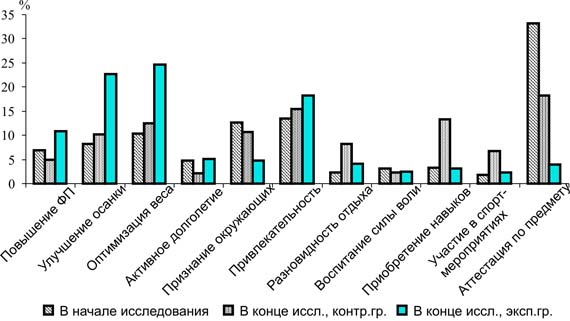 Наблюдаемое нами значительное увеличение практически всех контролируемых показателей обусловлено, на наш взгляд, заинтересованностью девушек в занятиях РГ. Занятия РГ по экспериментальной методике позволили придать новую смысловую окраску мотивации к избранной двигательной деятельности. До начала эксперимента ведущим мотивом была аттестация по предмету "физическая культура", но к концу учебного года произошло перераспределение мотивационно-ценностной ориентации. Доминирующими мотивами стали коррекция фигуры, снижение веса, желание стать грациозной, научиться танцевать и т.д. (рис. 4).