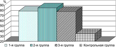 Анализ успешности выполнения предложенных комплексов свидетельствует о том, что в 3 экспериментальных подгруппах большинство студенток (соответственно 78,4; 84,6; 77,6%) регулярно справлялись с предлагаемыми им двигательными заданиями, в то время как в КГ только 34,8% занимающихся успешно выполнили предлагаемую программу (рис. 5).