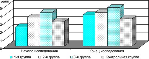 К моменту окончания исследования в ЭГ и КГ наблюдается достоверное (р<0,01, 0,05) увеличение суммы баллов, полученных в тесте соответственно на 48,9 и 27,8% и повышение функционального класса занимающихся на 37,7 и 21,3%.