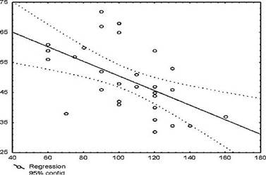 Тканевое напряжение кислорода в исходном состоянии у испытуемых контрольной группы составляло в среднем 68,1 мм рт. ст. На максимуме дыхательной нагрузки рО2 в контрольной группе составило в среднем 59,3±7,9 мм рт. ст., в экспериментальной - 48,7±12,0 мм рт. ст. (р<0,05). в экспериментальной группе снижение напряжения кислорода отрицательно коррелирует (r=-0,5434, р<0,01) с продолжительностью пробы (рис. 1). Уравнение регрессии имеет следующий вид: рO2 = 74,781 - 0,243*T, где Т - продолжительность пробы Штанге. В контрольной группе данная зависимость слабо выражена, что, очевидно, связано с небольшой продолжительностью МПЗД у этих испытуемых. С возобновлением внешнего дыхания тканевое напряжение кислорода у испытуемых продолжало падать еще в течение 10-20 с и снизилось до 56,0±8,3 и 42,4±11,0 мм рт. ст. соответственно в контрольной и экспериментальной группах.